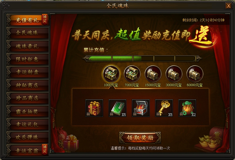 全民魂珠,海量材料送不停! 1. 充值有礼活动时间:2018年11月09日0点——11月12日23:59活动期间,充值元宝即可领取五档丰厚奖励,每天均可领取一次,不容错过! 活动奖励以游戏内实际显示为准 ...