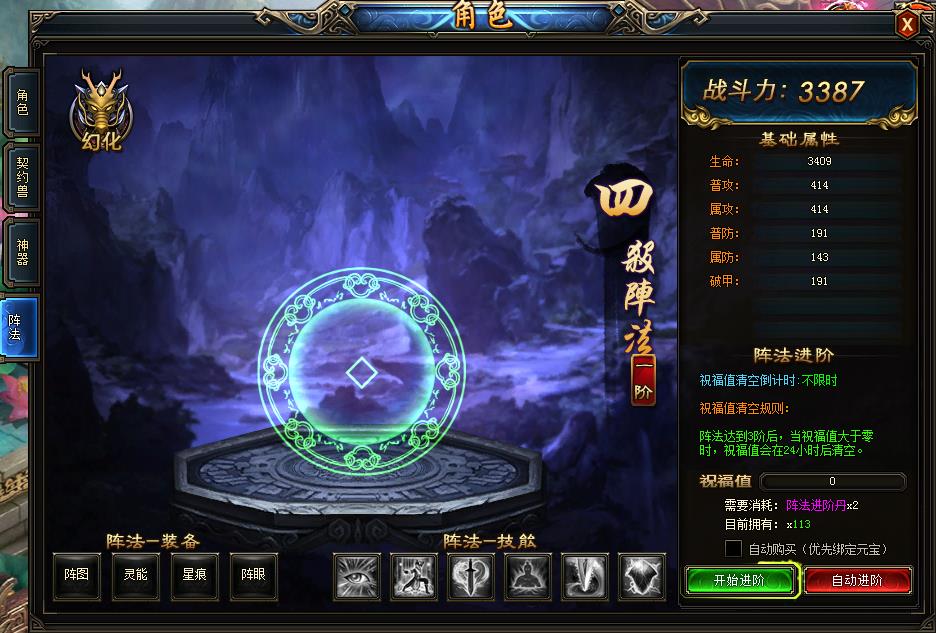 一、获得阵法 1.人物等级到达100级时可通过主线任务获得阵法,在人物—阵法界面中显示。 2.阵法等级与玩家等级一样但有等级上限,阵法品阶越高,上限等级越高。 3.阵法一共分为十阶,每次一进阶成功都可以有更高的战 ...