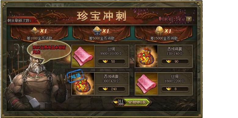 镇守襄阳斩陨铁,珍宝冲刺圆珍梦 活动一:珍宝冲刺,圆你十珍梦! 活动范围:11月22日(含)之前已开所有服 活动时间:12月2日0点至24点 参与条件:已开启丝绸之路的玩家 活动内容:活动期间,在活动界面可以购买丝 ...