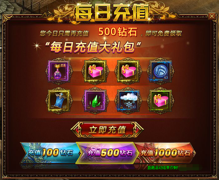 每日充值活动时间:2018.12.23 00:00:00-2018.12.25 23:59:59活动范围:大师200级以上的玩家活动内容:活动期间,每日累计充值分别达到100钻、500钻、1000钻,均可领取丰厚奖励; 充值100钻石可获得:8倍经验药水( ...