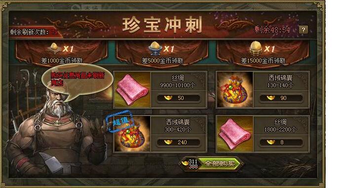 破阵顿悟奇门间,过关斩将获佳酿 活动一:珍宝冲刺,圆你十珍梦! 活动范围:12月12日(含)之前已开所有服 活动时间:12月22日0点至24点 参与条件:已开启丝绸之路的玩家 活动内容:活动期间,在活动界面可以购买丝 ...
