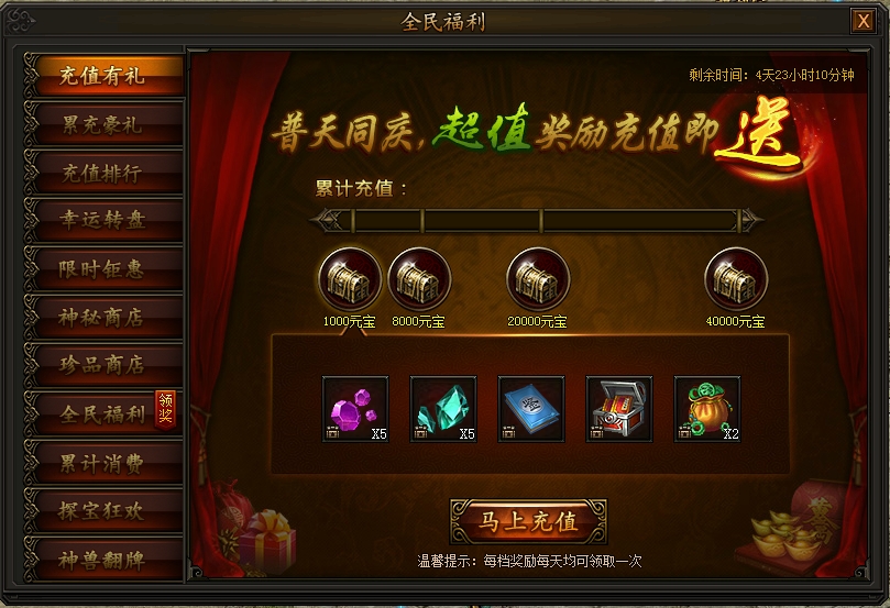 全民福利,海量材料送不停! 1. 充值有礼活动时间:2019年1月15日0点——2019年1月21日23:59活动期间,充值元宝即可领取四档丰厚奖励,每天均可领取一次,不容错过! 13. 霸业鉴宝活动时间:2019年1月19日0点—— ...