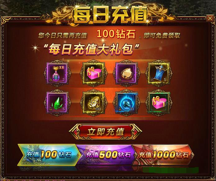 每日充值活动时间:2019.2.7 00:00:00-2019.2.9 23:59:59活动范围:大师200级以上的玩家活动内容:活动期间,每日累计充值分别达到100钻、500钻、1000钻,均可领取丰厚奖励; 充值100钻石可获得:8倍经验药水(普通 ...