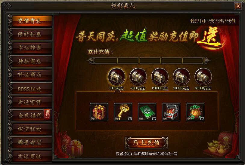 精彩豪礼,海量材料送不停! 1. 充值有礼活动时间:2019年2月8日0点——2月11日23:59活动期间,充值元宝即可领取五档丰厚奖励,每天均可领取一次,不容错过! &nb ...