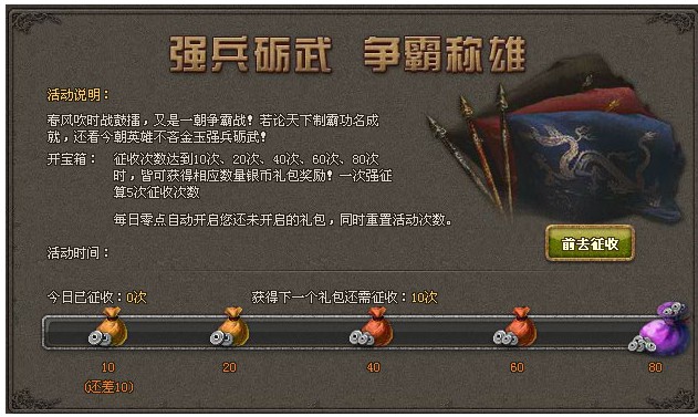 《傲视天地》征收活动公告 【活动时间】:3月31日0:00—24:00【活动内容】:开宝箱:征收次数达到10次、20次、40次、60次、80次时,可领取大量银币礼包!1次强征等于5次普通征收!礼包清空时间:每日凌晨0点 ...