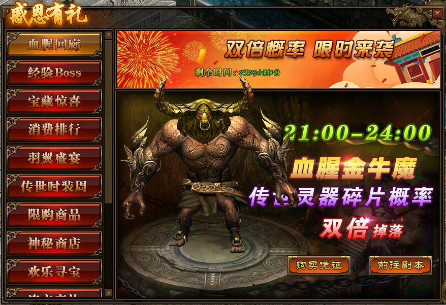 《传奇世界》网页版 感恩有礼 精彩活动 活动一、血腥回廊 活动时间:3月29日-3月31日活动范围:全服 活动内容:1. 活动期间,玩家参与“多人副本-血腥回廊”,获得“传世灵器碎片”的概率翻倍; ...