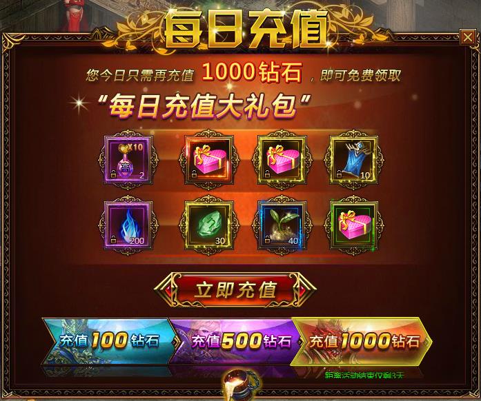 每日充值活动时间:2019.3.31 00:00:00-2019.4.02 23:59:59活动范围:大师200级以上的玩家活动内容:活动期间,每日累计充值分别达到100钻、500钻、1000钻,均可领取丰厚奖励; 充值100钻石可获得:8倍经验药水(普 ...