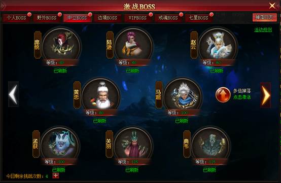 中立BOSS 1.玩家等级达到45级后,开启中立BOSS 4.每日10:00~23:00还会有强大的BUFF助你轻松拿下中立BOSS
