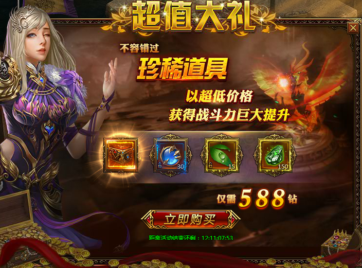 超值大礼 活动时间:2019.4.24 00:00:00-23:59:59 活动范围:大师1级以上的玩家 活动内容:活动期间以超低价格出售珍稀道具,使用可获得战斗力巨大提升!千万不要错过啦!参加活动可获得:1、超值大礼增强礼包打开可 ...