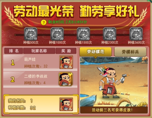 活动一 劳动最光荣,勤奋享好礼 活动范围:4月20日(含)之前已开所有服 活动时间:5月1日5:00至5月5日5:00 活动内容:活动期间,在农场种植农作物,即可参与活动,限定皮肤【劳动模范】等你来拿! ※ 活 ...