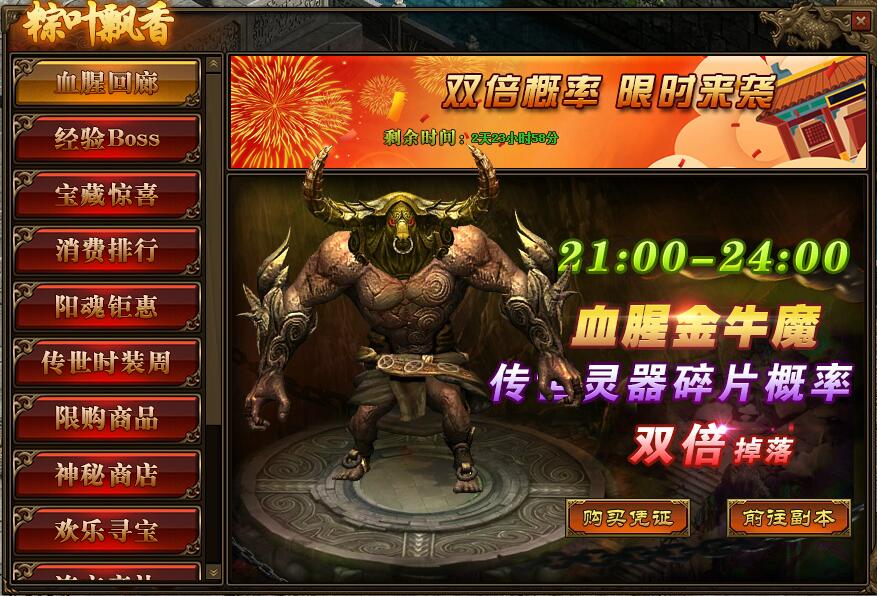 《传奇世界》网页版 粽叶飘香 精彩活动 活动一、血腥回廊 活动时间:6月5日-6月7日活动范围:全服 活动内容:1.活动期间,玩家参与“多人副本-血腥回廊”,获得“传世灵器碎片”的概率翻倍; ...