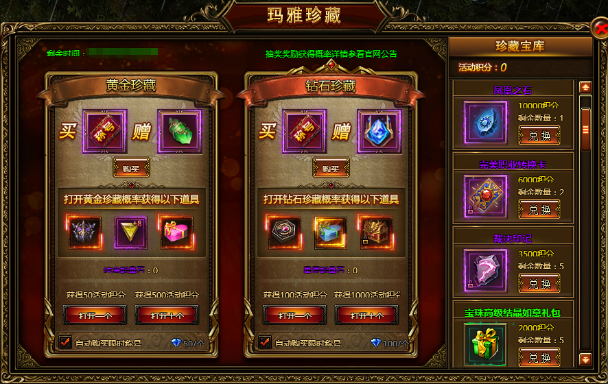 玛雅珍藏玛雅珍藏来袭,珍贵宝藏等你来发掘! 活动时间:2019.7.16 00:00:00-23:59:59 活动范围:大师1级以上的玩家 活动规则:(1)玩家可以购买能量石打开珍藏,获得各种珍稀道具,分为黄金珍藏和钻石珍藏。 (2) ...