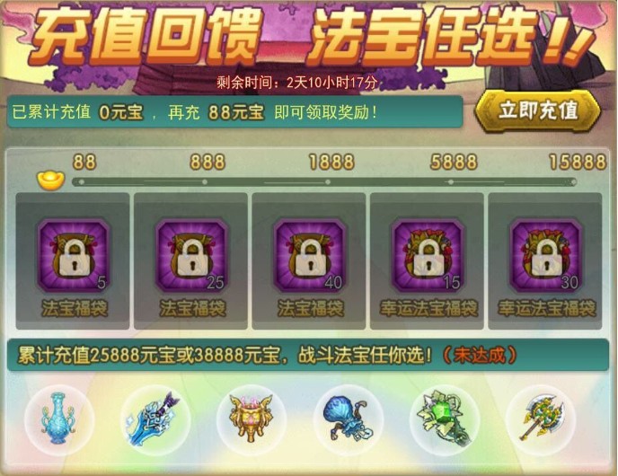 活动一 双法宝活动范围:8月15日(含)之前已开所有服 活动时间:8月26日5:00至8月28日5:00 活动内容:活动期间,累计充值至指定金额即可获得福袋奖励,累计充值至38888元宝及以上即可任意选择两个法宝。 ※ 活动玩 ...