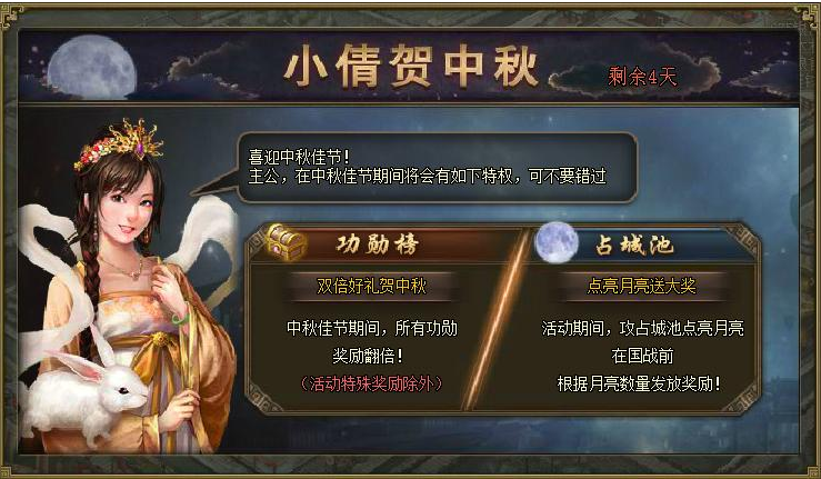 中秋福利,小倩贺中秋 活动一: 小倩贺中秋!活动范围:全服 活动时间:9月12日00:00至9月17日24:00参与要求:已开启功勋榜的玩家 活动内容:中秋佳节内,所有功勋榜奖励翻倍,攻占城池点亮月亮,国战前可获得大量 ...