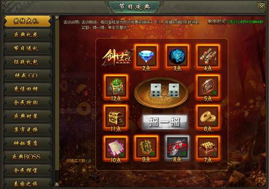 活动时间:10月1日 0:00-7日 24:00活动范围:开服天数〉7天的服务器活动一:登录大礼活动说明:活动期间,每日登录游戏,可免费摇筛子1次,根据点数有机会获得稀有材料、元宝匣、钻石等稀有奖励 ...