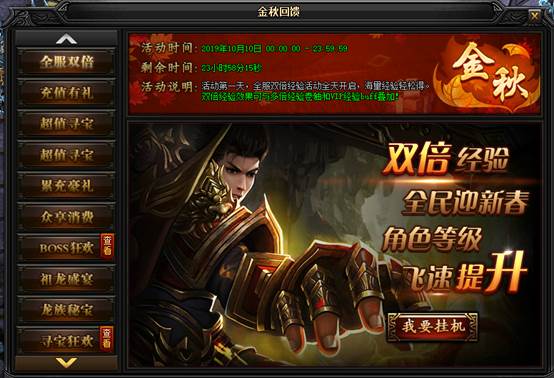 蓝月传奇·金秋回馈活动时间:10月10日00:00:00-10月12日23:59:59 活动一:全服双倍活动时间:10月10日00:00:00 - 23:59:59活动说明:活动第一天,全服双倍经验活动全天开启,海量经验轻松得。双倍经验效果可与多倍 ...