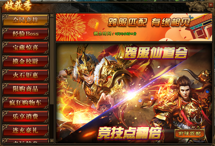 《传奇世界》网页版 收获季 精彩活动 活动一、全民竞技 活动时间:10月15日-10月17日活动范围:全服 活动内容:1.活动期间,玩家参与跨服仙道会3V3或5V5匹配,获得“竞技点”翻倍; ...