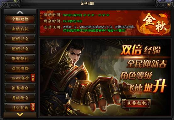 蓝月传奇·金秋回馈活动时间:10月30日00:00:00-11月1日23:59:59 活动一:全服双倍活动时间:10月30日00:00:00 - 23:59:59活动说明:活动第一天,全服双倍经验活动全天开启,海量经验轻松得。双倍经验效果可与多倍经 ...