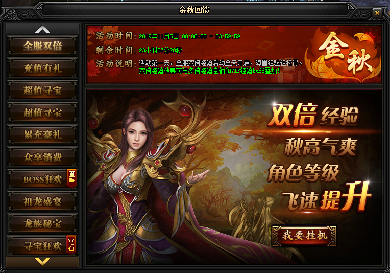 蓝月传奇·金秋回馈活动时间:11月5日00:00:00-11月7日23:59:59 活动一:全服双倍活动时间:11月5日00:00:00 - 23:59:59活动说明:活动第一天,全服双倍经验活动全天开启,海量经验轻松得。双倍经验效果可与多倍经验 ...