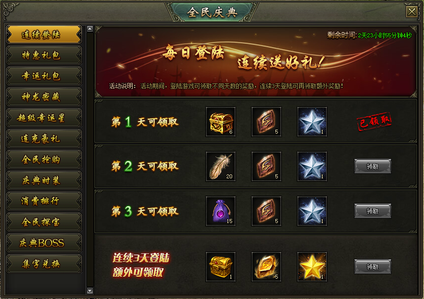 活动时间:11月8日 0:00-11月11日 24:00活动范围:开服天数〉7天的服务器活动一:连续登陆活动说明:活动期间,登陆游戏可领取不同天数的奖励,连续3天登陆可再领取额外奖励 ...