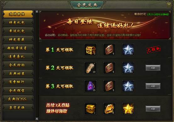 活动时间:11月15日 0:00-11月17日 24:00活动范围:开服天数〉7天的服务器活动一:连续登陆活动说明:活动期间,登陆游戏可领取不同天数的奖励,连续3天登陆可再领取额外奖励 ...