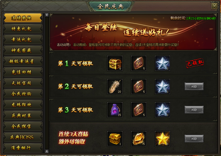 活动时间:12月5日 0:00-12月7日 24:00活动范围:开服天数〉7天的服务器活动一:连续登陆活动说明:活动期间,登陆游戏可领取不同天数的奖励,连续3天登陆可再领取额外奖励 ...
