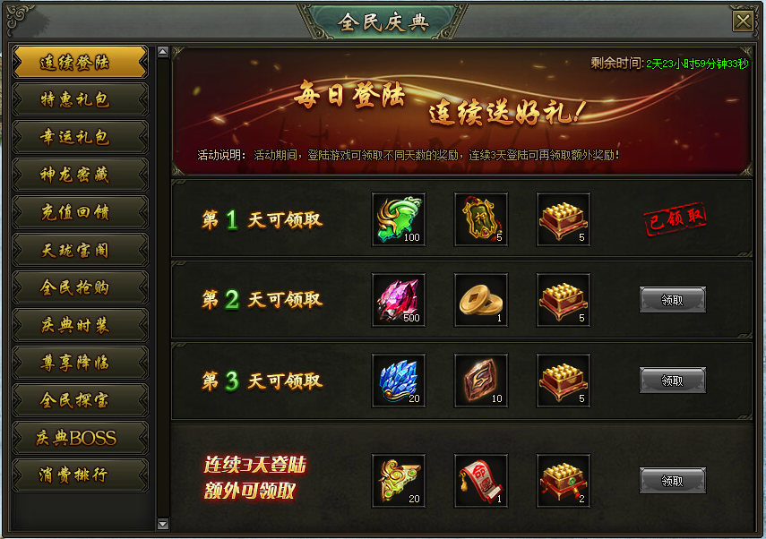 活动时间:1月16日 0:00-1月18日 24:00活动范围:开服天数〉7天的服务器活动一:连续登陆活动说明:活动期间,登陆游戏可领取不同天数的奖励,连续3天登陆可再领取额外奖励 ...