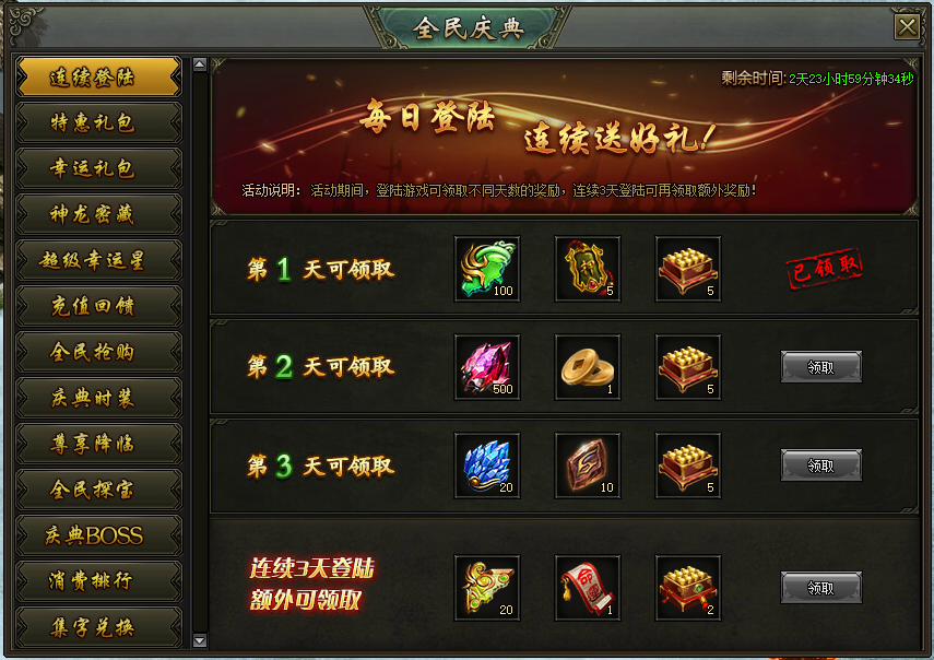 活动时间:2月6日 0:00-2月8日 24:00活动范围:开服天数〉7天的服务器活动一:连续登陆活动说明:活动期间,登陆游戏可领取不同天数的奖励,连续3天登陆可再领取额外奖励 ...