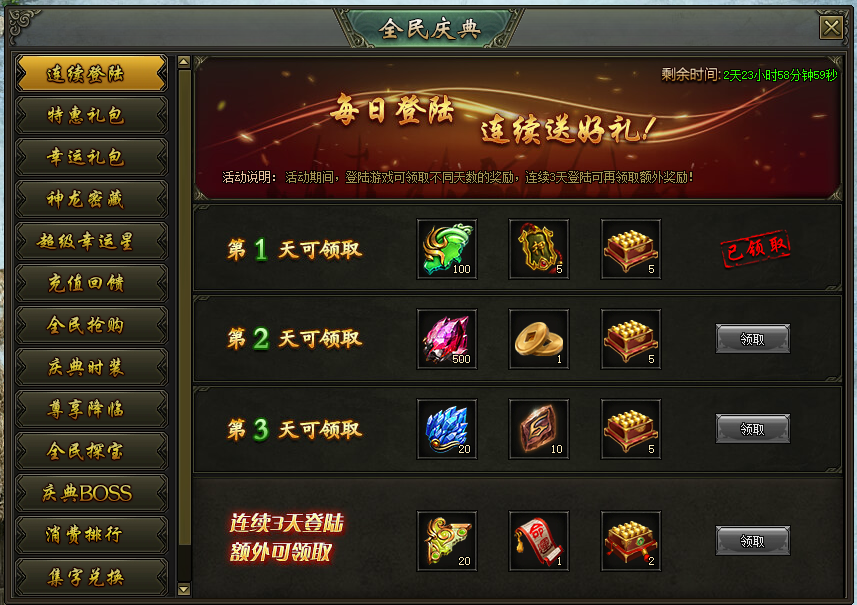活动时间:2月13日 0:00-2月15日 24:00活动范围:开服天数〉7天的服务器活动一:连续登陆活动说明:活动期间,登陆游戏可领取不同天数的奖励,连续3天登陆可再领取额外奖励 ...