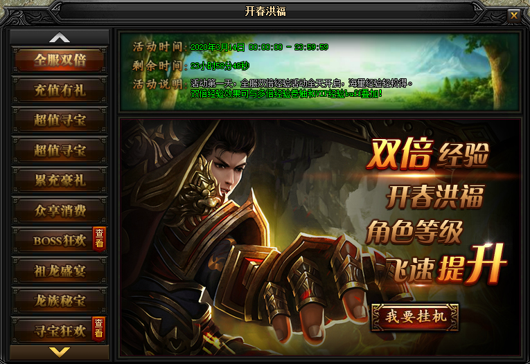 蓝月传奇·开春洪福活动时间:3月14日00:00:00-3月16日23:59:59 活动一:全服双倍活动时间:3月14日00:00:00 - 23:59:59活动说明:活动第一天,全服双倍经验活动全天开启,海量经验轻松得。双倍经验效果可与多倍经验 ...