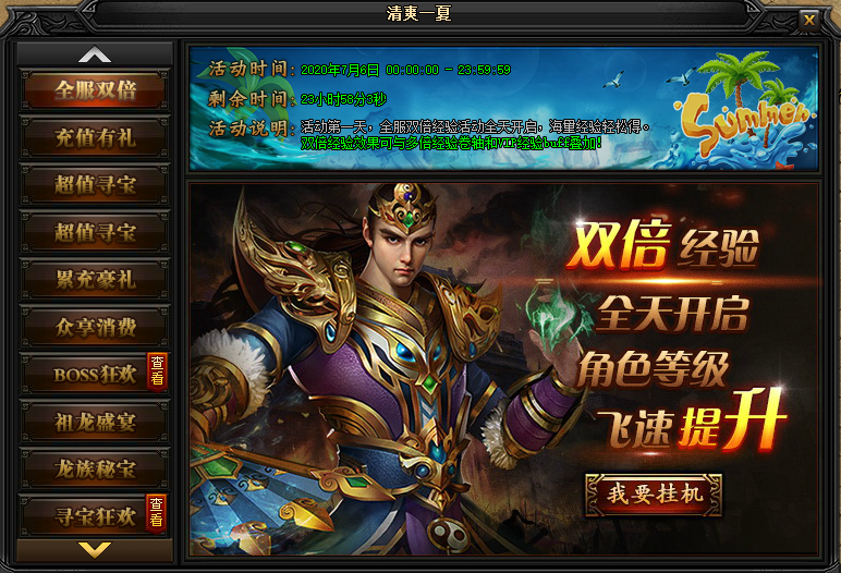 蓝月传奇·清爽一夏活动时间:7月6日00:00:00-7月8日23:59:59 活动一:全服双倍活动时间:7月6日00:00:00 - 23:59:59活动说明:活动第一天,全服双倍经验活动全天开启,海量经验轻松得。双倍经验效果可与多倍经验卷 ...