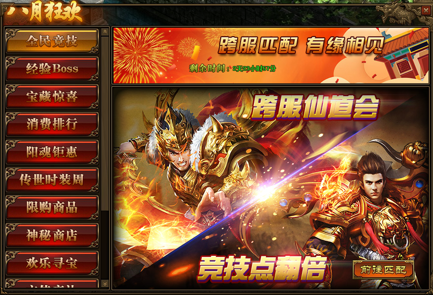 《传奇世界》八月狂欢 精彩活动 活动一、全民竞技 活动时间:8月2日-8月4日活动范围:全服 活动内容:1.活动期间,玩家参与跨服仙道会3V3或5V5匹配,获得“竞技点”翻倍; ...