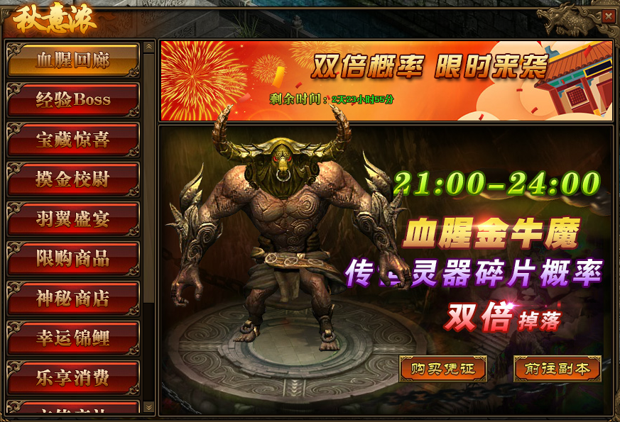 《传奇世界》网页版 秋意浓 精彩活动 活动一、血腥回廊 活动时间:9月17日-9月19日活动范围:全服 活动内容:1.活动期间,玩家参与“多人副本-血腥回廊”,获得“传世灵器碎片”的概率翻倍; ...