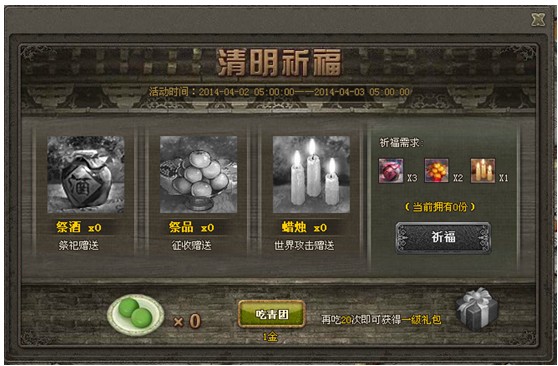 《傲视天地》清明节活动公告 【活动时间】:4月5日凌晨5:00——4月6日凌晨5:00【活动内容】:l 活动期间,所有玩家都可通过游戏凑齐祭品进行祈福,祈福后可获得各种资源l 材料获取:祭祀获得 ...