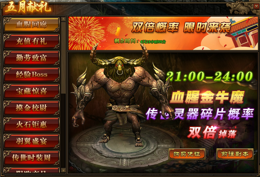 《传奇世界》网页版 五月献礼 精彩活动 活动一、血腥回廊 活动时间:4月29日-5月5日活动范围:全服 活动内容:1.活动期间,玩家参与“多人副本-血腥回廊”,获得“传世灵器碎片”的概率翻倍; ...
