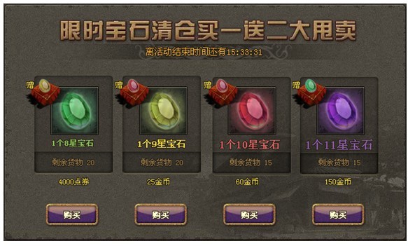 【活动时间】:4月9日5:00——4月10日5:00【活动内容】:l 活动时间内,宝石将以优惠的价格倾销大甩卖,买一送二。l 活动期间,每个玩家获得4堆商品的倾销机会,玩家可进行选择性的购买。l&nb ...