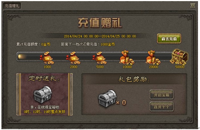 充值送宝箱 好礼送不停 贺新版购物有礼免费送,丰厚赠品大回馈活动时间:4月26日0点--24点活动规则:1) 累计充值达到一定的额度,就可以领取对应的充值礼包2) 充值礼包可获得金币,宝石,点券等丰厚奖励3) 充值50 ...