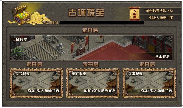新古城探宝活动公告 【活动时间】4月27日5点--4月29日5点【基本规则】1、101级(含)以上玩家可以参加探宝活动2、活动期间每天有5次探险机会,可获得超级探宝入场券3、活动第二天开启超级探宝,分别有玉石、宝石、 ...