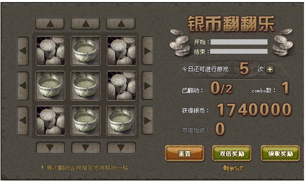 银币翻牌公告 【活动时间】:4月29日5:00——4月30日5:00【活动内容】: 1. 活动期间,所有玩家都可参加银币翻翻乐活动。 2. 每天有5次免费游戏次数,可通过金币增加次数。每天有8次免费翻倍次数。3. 每轮只能翻动两 ...