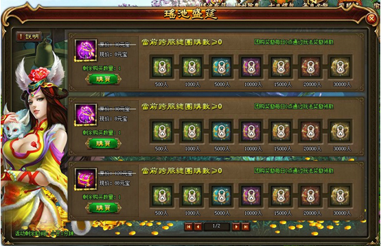 本周新增活动一:瑶池盛筵开启活动时间:2014年5月14日00:00——2014年5月20日23:59活动内容:玩家每日可购买瑶池盛 ...
