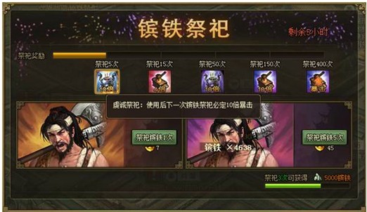 【兵器速升】镔铁祭祀,暴击连送! 活动范围:5月12日(含)之前所有已开在线服 活动时间:5月19日0点至5月20日24点活动内容:活动期间,达到以下镔铁祭祀要求,即可获赠额外镔铁奖励,并领取相应的暴击Buff!1. 每3 ...