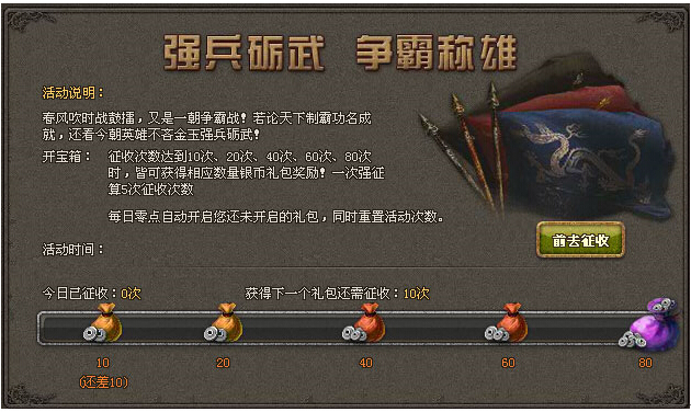 《傲视天地》征收活动公告 【活动时间】:5月27日0:00—24:00【活动内容】:开宝箱:征收次数达到10次、20次、40次、60次、80次时,可领取大量银币礼包!1次强征等于5次普通征收!礼包清空时间:每日凌晨0点 ...