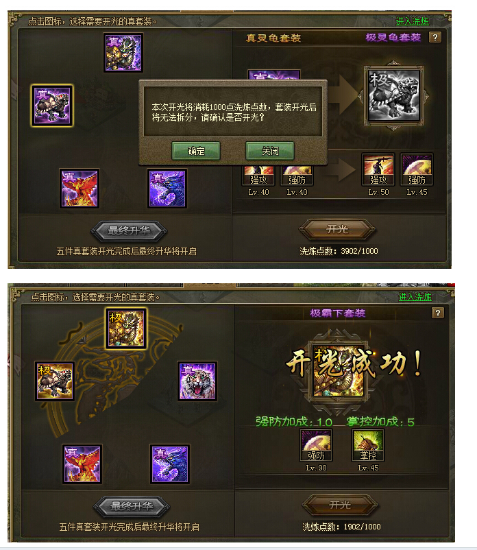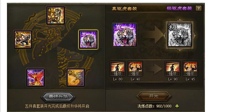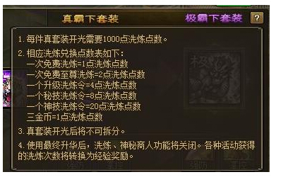 每件真套装开光后就能获得极套装,每件套装开光需要消耗1000点洗练点数。