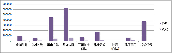 国战任务中集体奖励最多的是坚守边疆,图中的数据是最后一轮奖励,每坚守成功一轮奖励都增加;