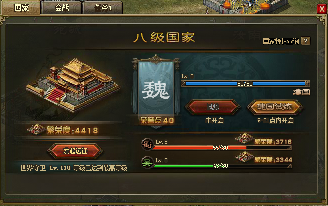 新版更新后,增加的建国系统,引起广大玩家的关注! 经过我们不懈努力,31服魏国早已是80分,可以开启试炼任务, 无奈总是不能开启建国, 后经多方查证,才知道有远征是不能开启的, 这个问题官方是不是应该引起重视? 三国远征这么频繁,很难控制三国都没有远征。 今天正好是远征来袭,正是好机会,远征结束至4.30分前就是个好机会! 我们已经迫不及待了!