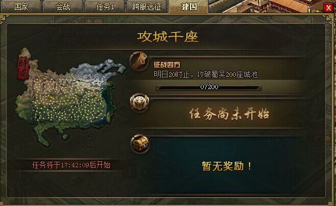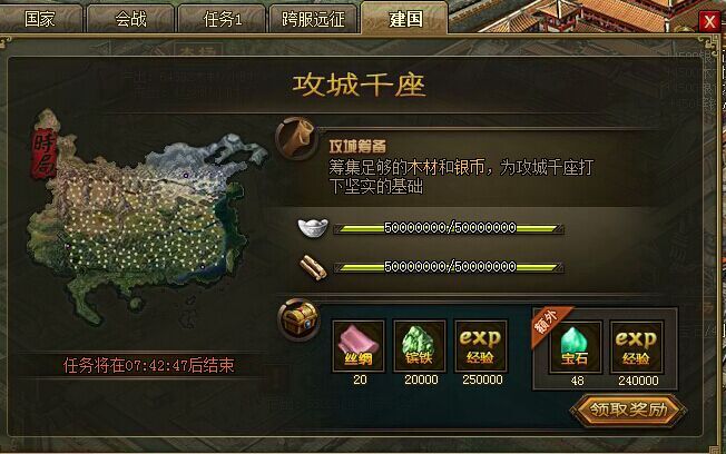 一、建国大业第一天 首先必须达到8级国家后,通过国战拿到国家分80分 点击开始试炼,点击不了 才发现国家里多了一个建国的选项 全国筹集木材5000万,银币5000万, 进献木材、银币有宝石奖励哦 因为太激动,忘了截图了!有知道多少奖励的请补充! 筹集满了后可以领取奖励 小倩来报告 明天9点正式开始攻城 200座 晚上20点前完成任务 这个任务太简单了吧 第二天是完成300城, 第三天是500城, 正好是完成攻城1000座!