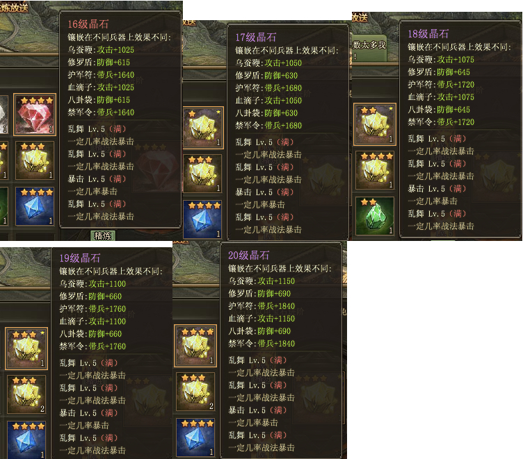16级晶石颜色跟15级一样为红宝石,但是值得吐槽的是17-20级晶石颜色为黄色,跟9-12级宝石的颜色几乎一样,这个雷同应该不属于巧合了